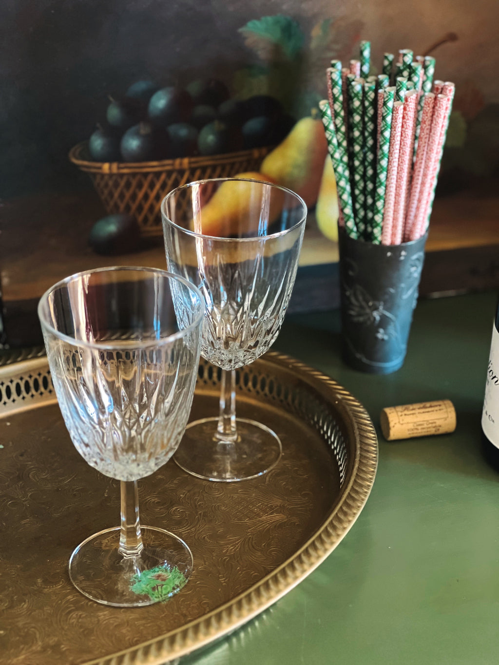 Classic French crystal wine glass with a beveled stem and generous proportions. It measures 6 3/4" high with a 3 1/4" mouth. It holds 8 fluid ounces. Sold as open stock (single stem), please select quantity desired from drop down menu. It has no chips or cracks and is in excellent condition.